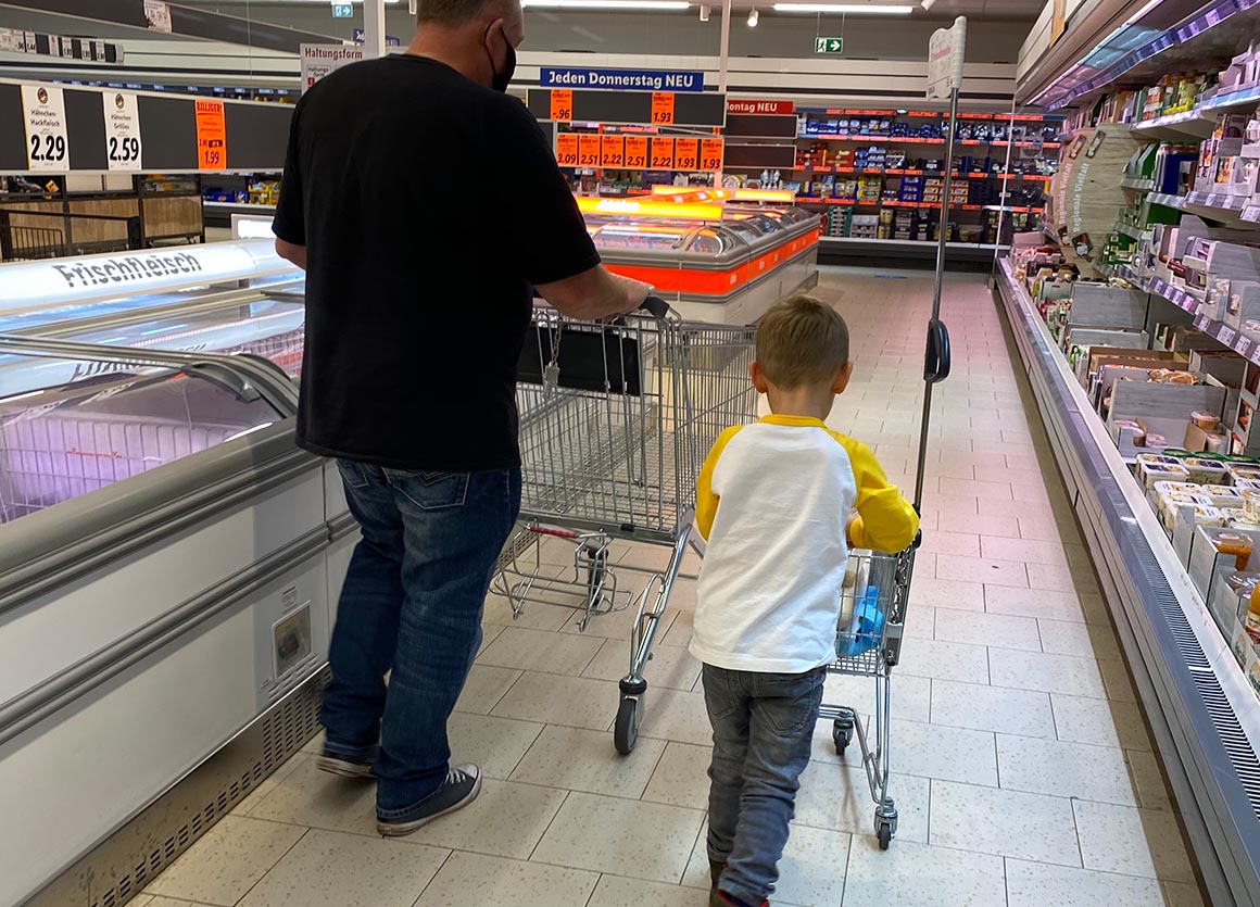 Noah war voller Energie und begeistert davon, Papa bei seinen Einkäufen zu helfen. Es war schön zu sehen, wie sie gemeinsam durch die Regale streiften und all die Dinge sorgfältig aussuchten, die wir für ein köstliches Frühstück am nächsten Morgen brauchten.